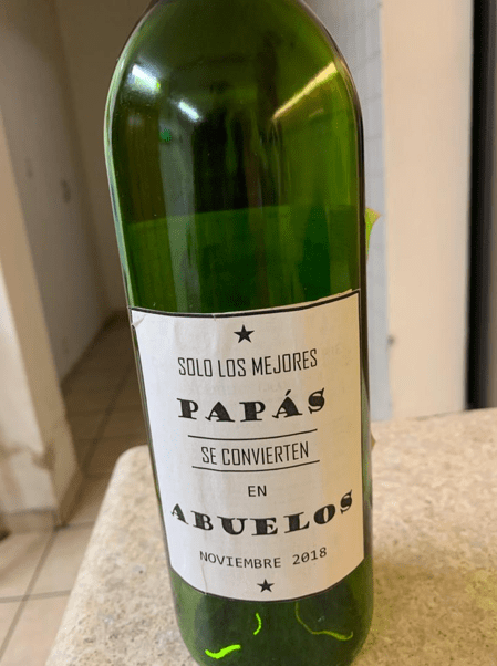La fecha antes mencionada nos pregunta mi hija y su esposo si nos reunimos a cenar. Al llegar nos entregan una botella de vino y yo ahora mas lento de pensamiento, y como aficionado a los vinos, les daba las gracias por el regalo, mas me dice mi hija que viera la etiqueta del reverso que es la siguiente foto.