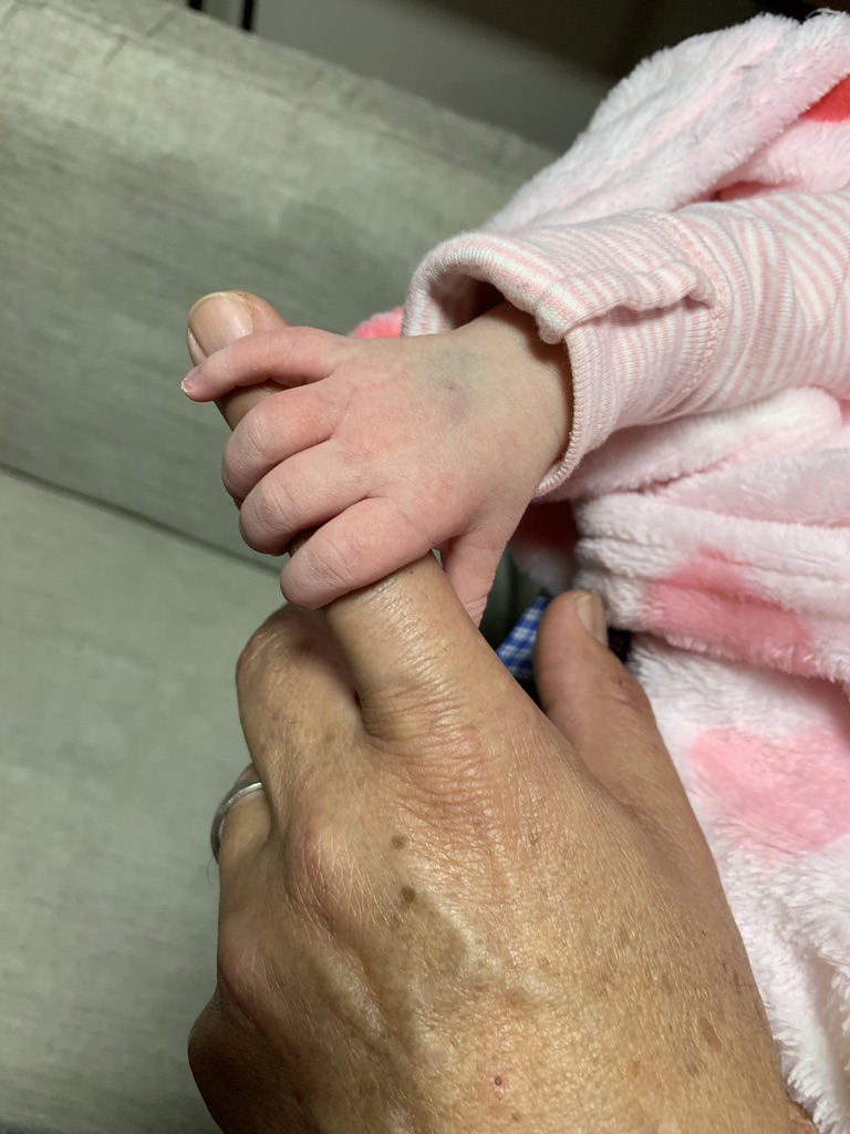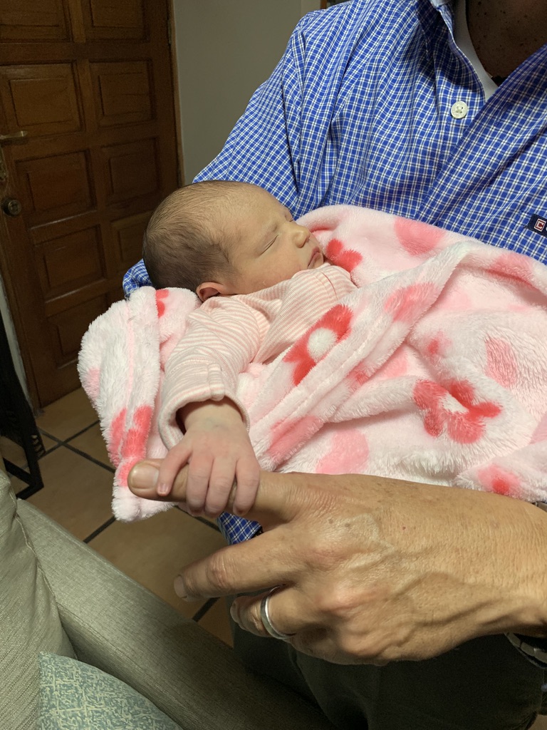 Al día siguiente de salir del hospital, fuimos a su casa y nunca voy a olvidar como, al sostenerla en mis brazos, su mano sujeto mi dedo índice fuertemente, y por suficiente tiempo como para pedir que me tomaran una foto. Fue un momento muy especial y (aunque no sigo el esoterismo), una energía recorrió mi cuerpo, era una forma de comunicación que, sin palabras, en un simple apretón de mano esa pequeña sabía que podía confiar plenamente en mi. Era como si al sujetarme fuertemente me dijera, abuelo, cuento contigo, siento tu cariño. Este contacto silencioso ha sido lo maximo, un amarre que ira tejiendo experiencias, vivencias, anhelos y sueños. Esa conexión y el lazo que desde entonces iniciamos lo estamos fomentando y estoy seguro que habrá momentos de alegría y tristezas, pero el cariño y amor serán la columna principal para seguir tejiendo esta historia.