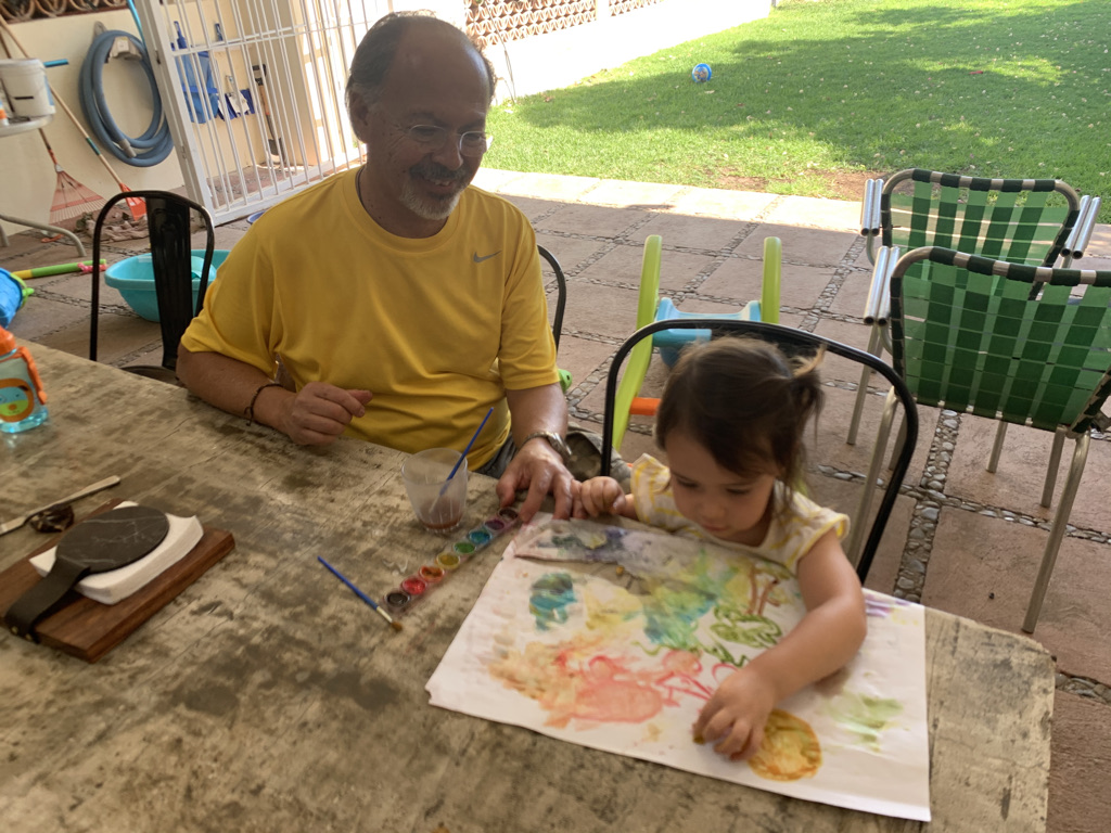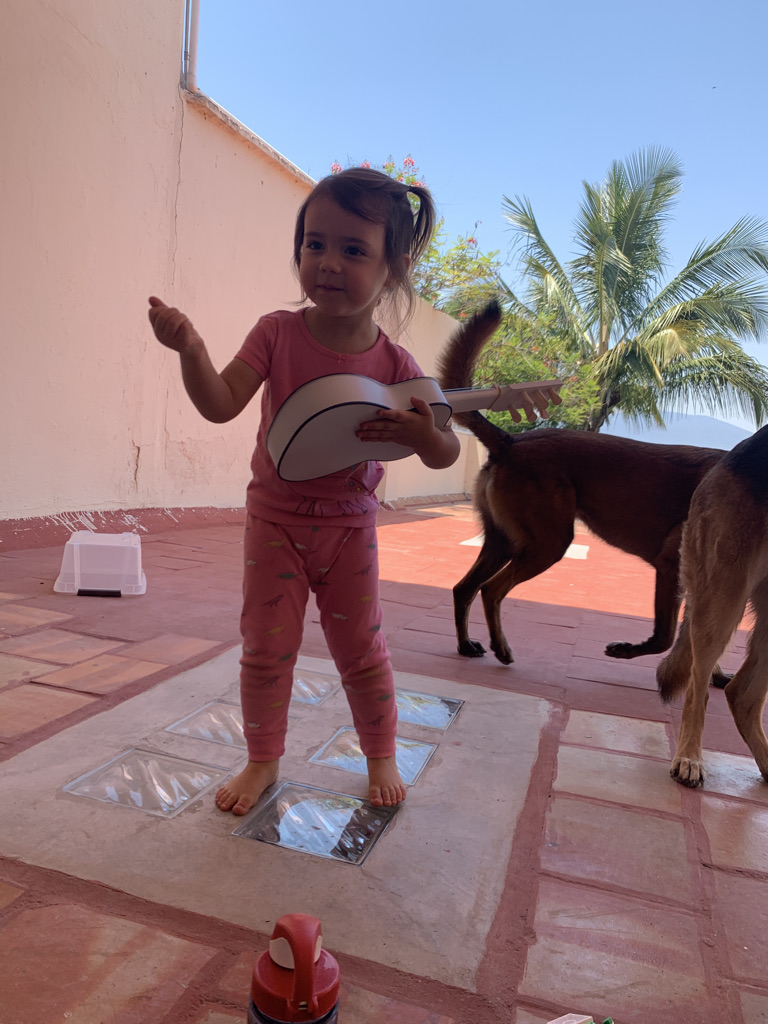 Respirábamos aire puro, escuchábamos las aves cantar y ella ponía atención en esos cantos pues con el dedito tocándose el oído me dejaba saber que estaba escuchando algo. En las tardes, en el jardín, nos acostábamos en el pasto y gritábamos cuando veíamos venir las formaciones de pelicanos volando a sus nidos. Ayudaba a bañar a Kimba y a Tessa, colaboró en otras labores como en darles sus croquetas y recoger sus desechos. Apoyó por propia iniciativa a lavar trastes, sacudir y barrer con el kit infantil que le conseguimos.