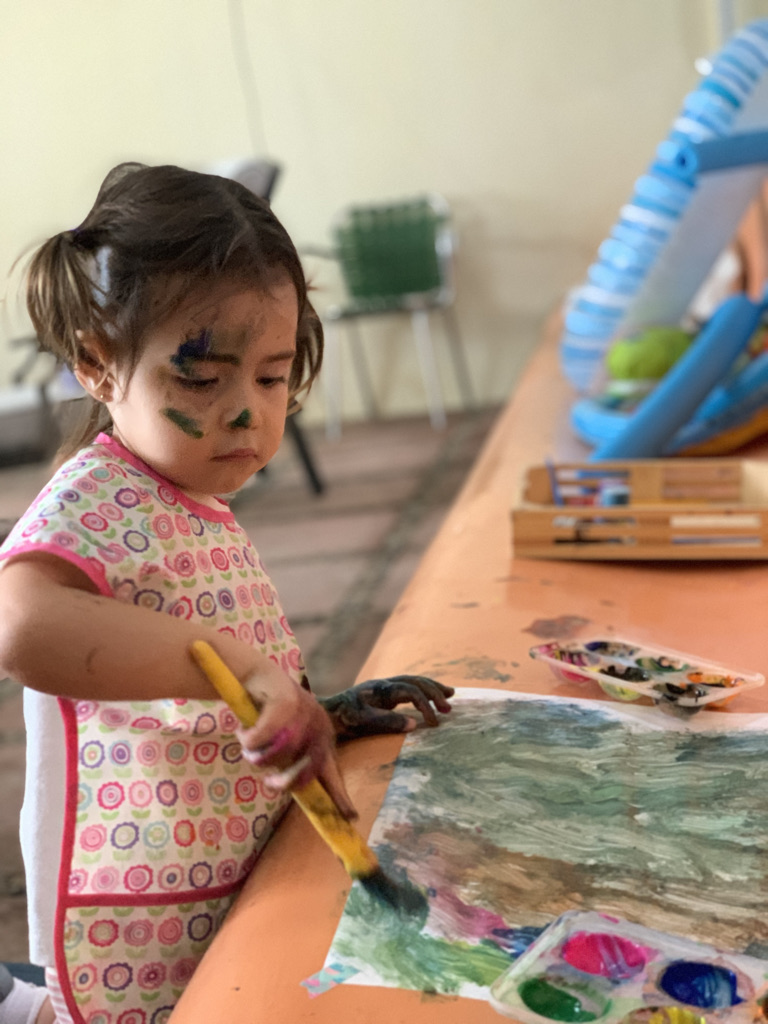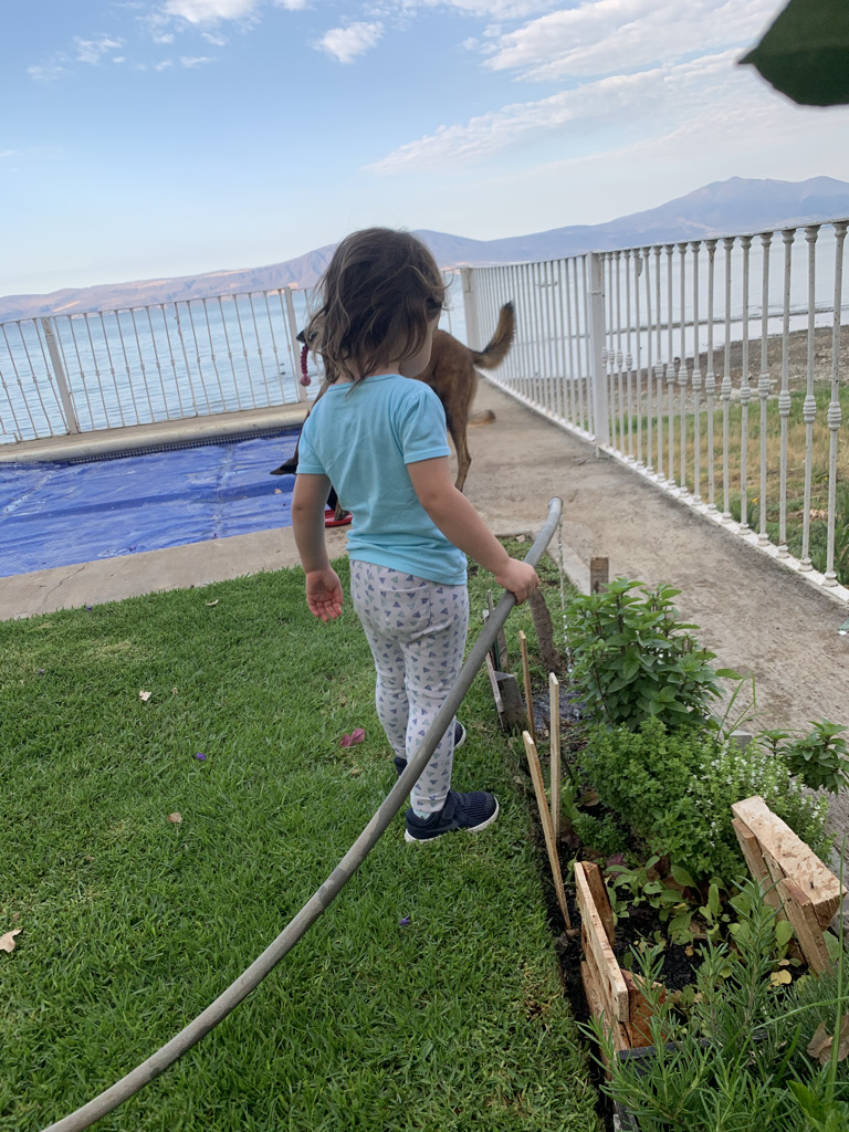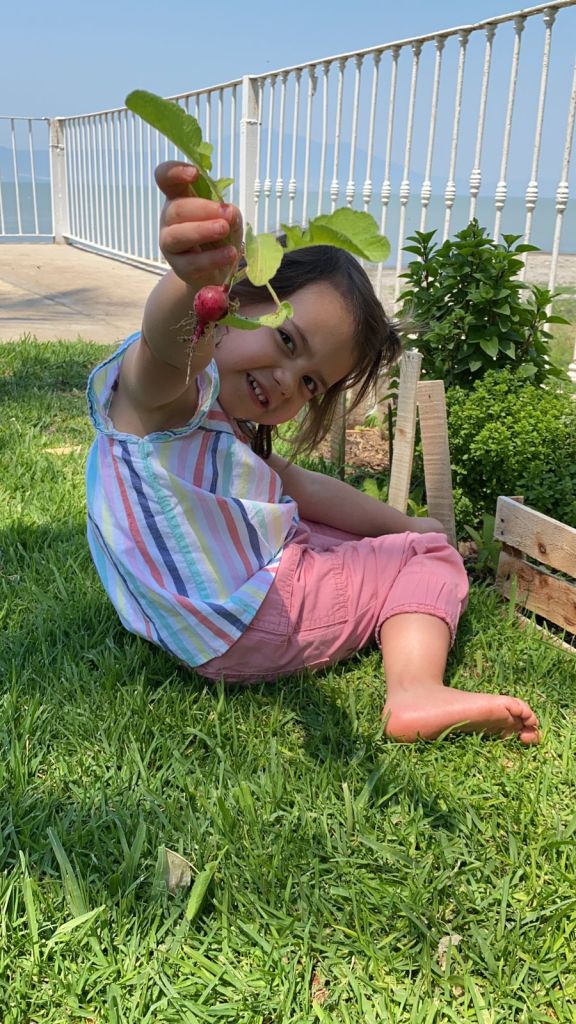 En ese tiempo jugó con tierra, y cooperó a iniciar un pequeño huerto. Descubrió que el agua es fascinante, y creo que es de lo que más le ha gustado y además de aprender a abrir las llaves y mojarse, también regábamos las plantas, y después cosechó jitomates, albahaca, romero y rábanos.