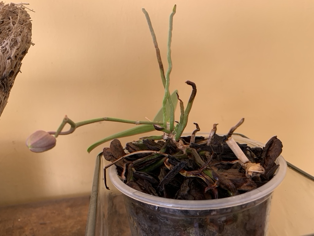 Y referente a la pequeña orquídea, esta sigue mejorando y hace un par de meses, crecieron mas tallos, hojas y de una ramita nueva (4 años después del accidente) aparecieron dos botones. Pensé que al fin tendría flores. Ya estaba a punto de abrir uno cuando este se desprendió sin abrir. Tristemente a los dos días cayo el segundo. Pero va mejorando y veo que requiere mas tiempo y cuidados y se que en un futuro cercano esta florecerá de nuevo. Nota: Pilin me esta ayudando siempre que va a la casa a regar y cuidar de las orquídeas.