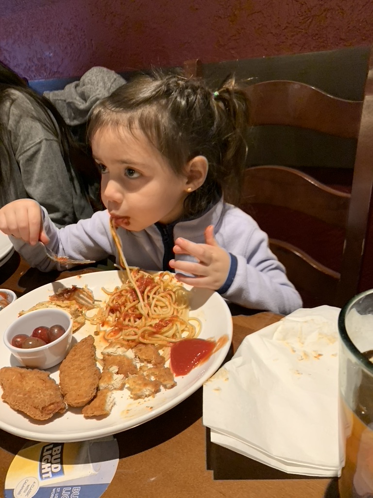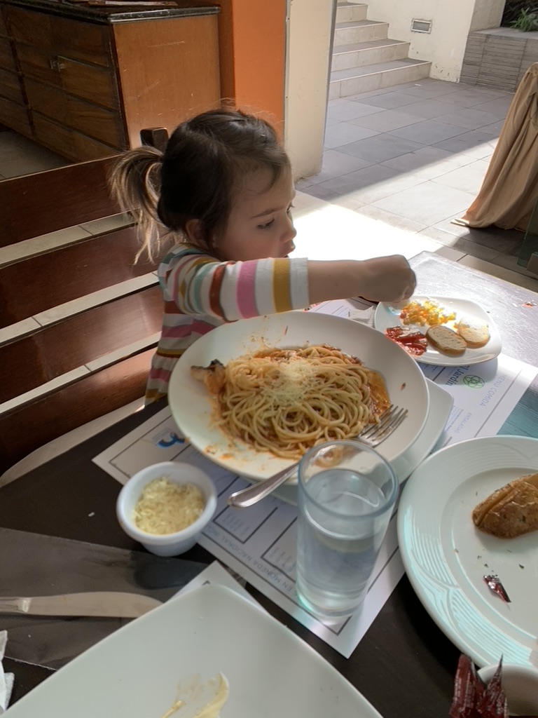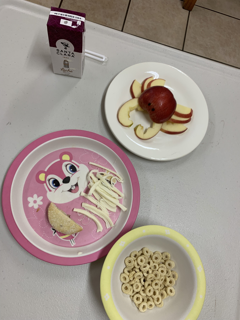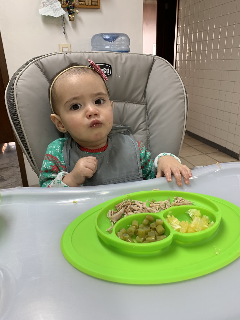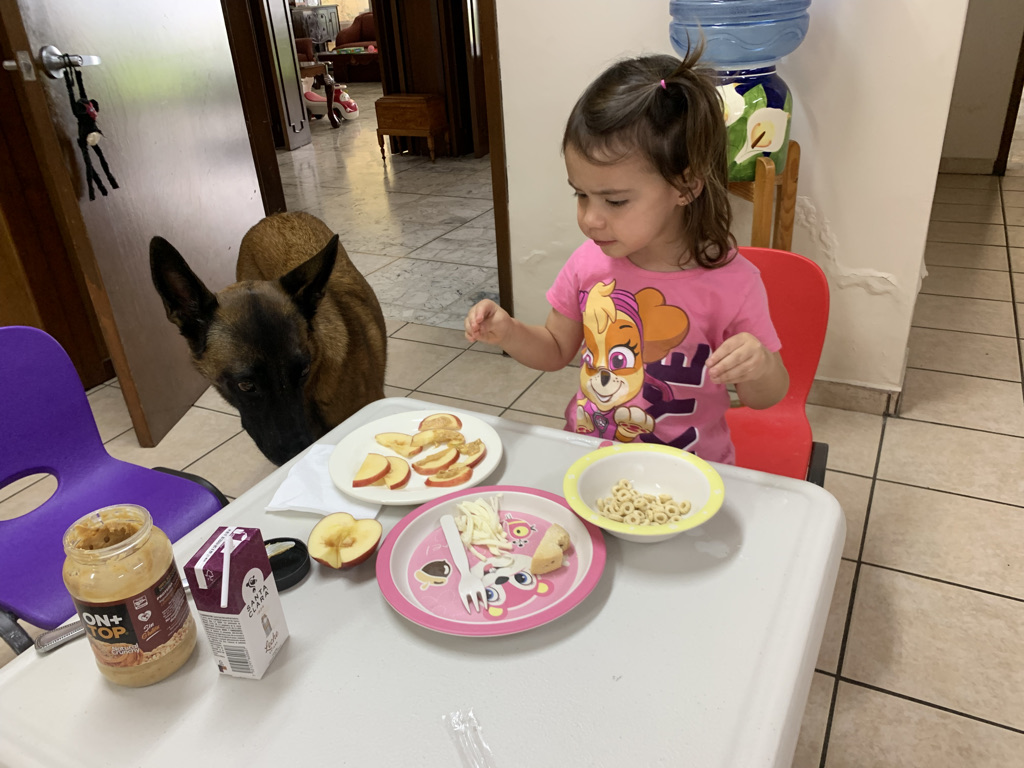 Sus padres son muy dedicados y se preocupan por alimentación saludable, variada y balanceada (hasta 4 cosas diferentes en cada comida) y con esto cuando por alguna razón solo le ponemos dos o tres cosas en su plato nos dice ¿! Algo mas !? Señalando un espacio en su plato y que le gustaría contar con alguna otra cosa.