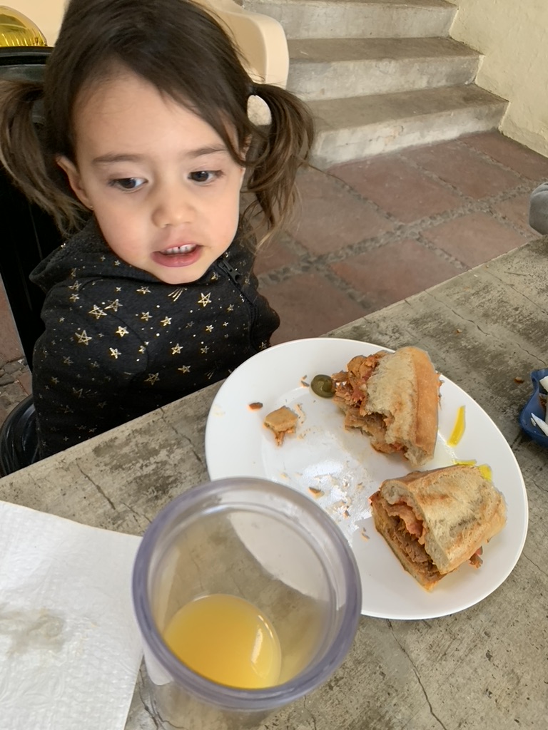 Respecto a seguir descubriendo alimentos, hace poco estábamos platicando en familia algo de las comidas y mencioné la palabra “lonche” a lo que Pilin me dijo, ¿Abu, que es lonche? Como pude le explique y la siguiente semana que nos reunimos a comer en familia compre lonches de pierna de la colonia del fresno y así me toco ver como incursionaba en probar uno de los alimentos comunes en nuestra ciudad. Le ayudamos a sujetar el lonche para que lo pudiera morder pues sus manos aun son pequeñas para sostener medio lonche que le cortamos, mismo que disfrutó.