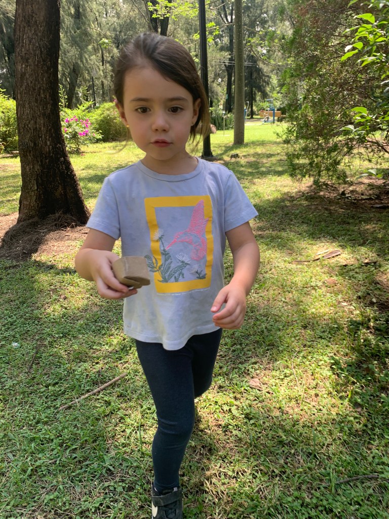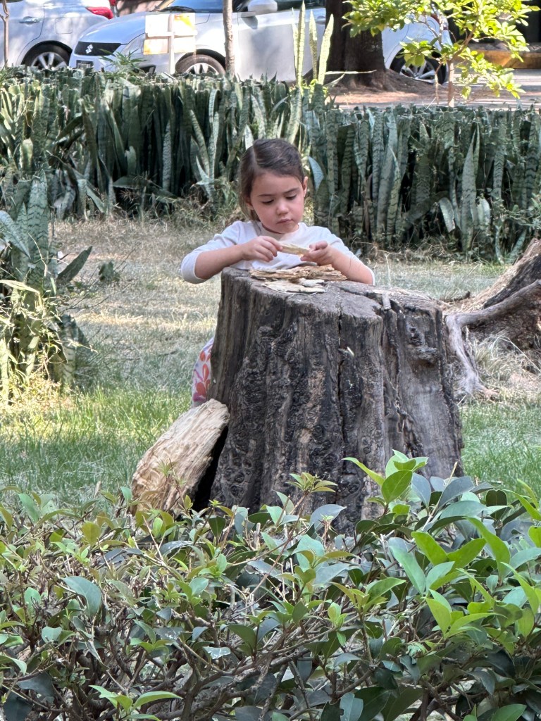 Me fascina ver sus juegos y actividades imaginarias, otras son muy reales como cuando unos lanzan piedras, o usan palos como “machetes” para “cortar” árboles, hacen fogatas (estas si imaginarias), hacen equilibrio sobre troncos, le toman prestada la manguera al jardinero, que se enoja por que la mueven, y en fin una serie de actividades sin contar los resbaladeros, columpios y bimbaletes y hasta me ha tocado leerles algún libro que ellos llevan y compartir con un “snack” (como jícama, obleas, fruta, etc que llevamos).